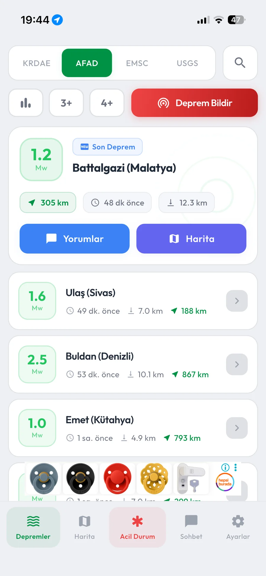 AFAD, Kandilli, EMSC ve USGS verileri tek listede; konuma göre mesafe ve büyüklük filtreleri ile.